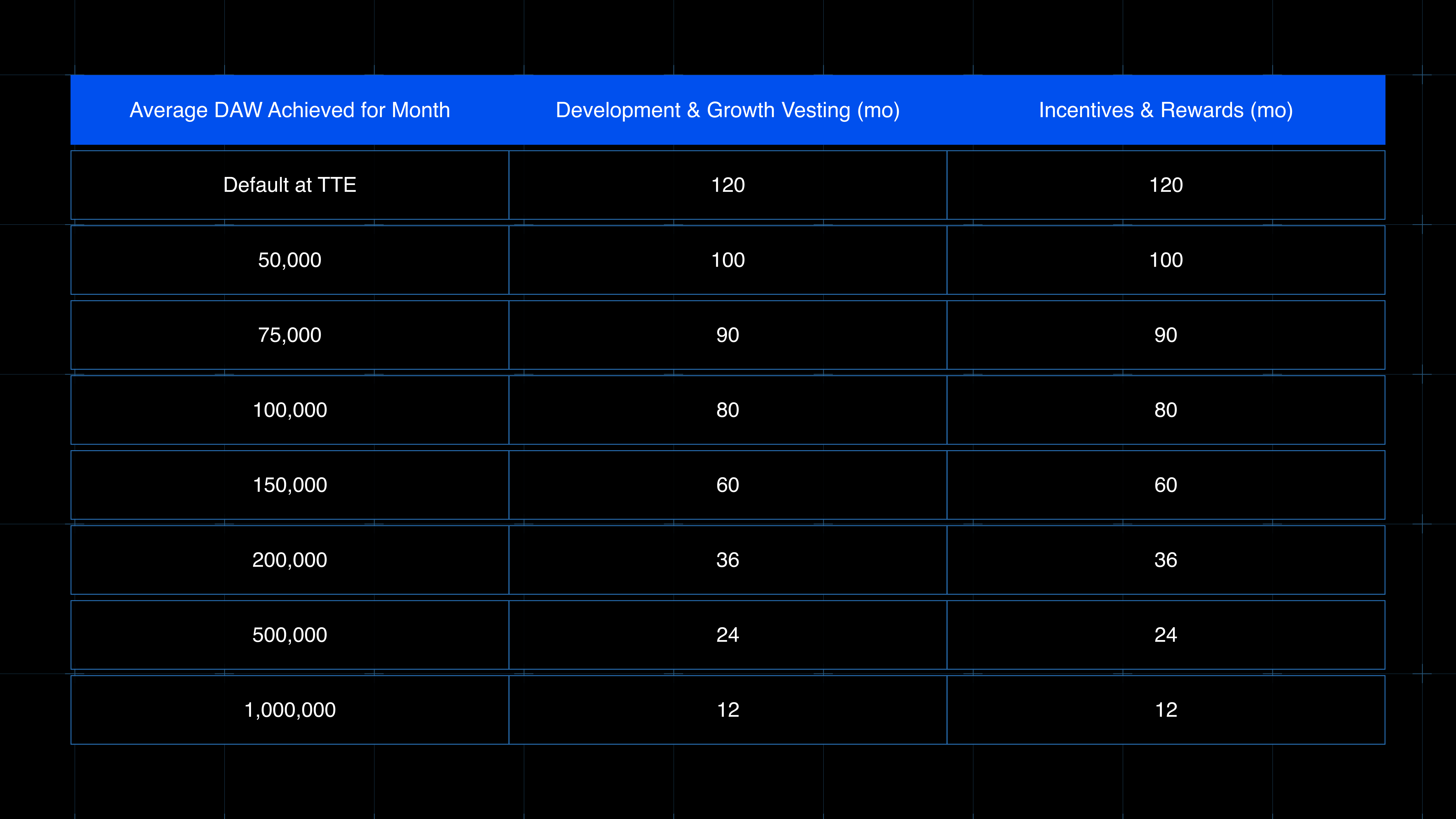 This pioneering vesting framework introduces a dynamic approach that factors in both the ‘Development and Growth and ‘Incentive and Rewards’ token allocations. In a scenario of zero growth from the time of the TTE, both allocations will vest over a 10-year period. Simultaneously, as specific growth milestones are achieved, the vesting schedule will compress, facilitating the release of a higher volume of tokens each month.