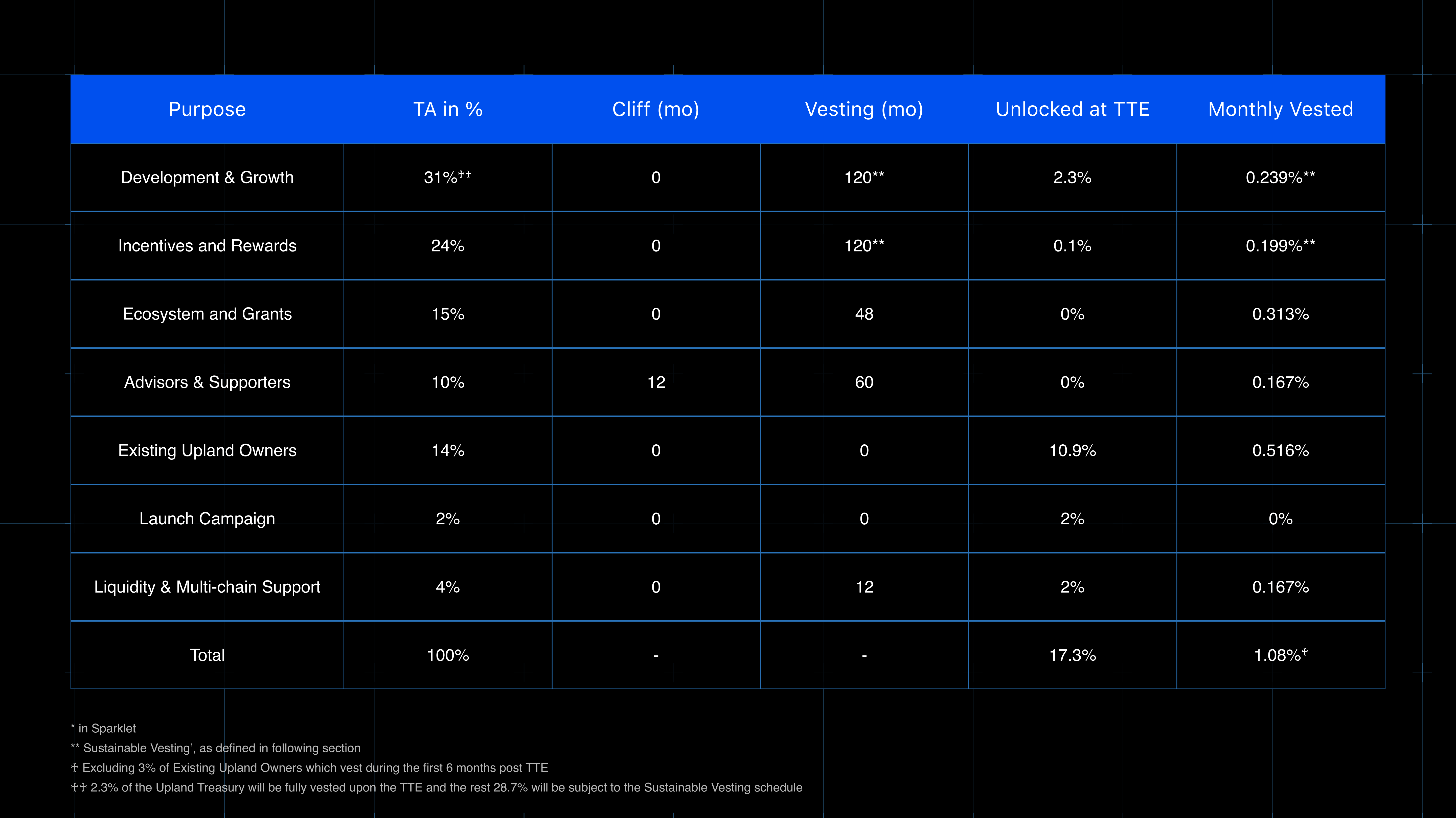 These are SPARKLET tokens that are already owned by existing players on the Upland platform. At TTE, these tokens will be considered as already uploaded to Upland (see Bridging from Ethereum to Upland). This allocation comprises 7.55% of tokens already owned by players, in addition to 6.45% which will be used to increase the existing owner’s stake relative to the fully diluted token supply. Any unclaimed tokens form this allocation will be forwarded to Incentives & Rewards. &#x20;